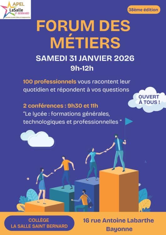 Tu te questionnes sur ton avenir ? Collégien ou lycéen de tous établissements, ce forum est fait pour toi ! Viens découvrir des métiers et rencontrer des professionnels de tout horizon ! Nous te donnons rendez-vous le samedi 31 janvier de 9h à 12h, au sein du collège La Salle St Bernard à Bayonne.