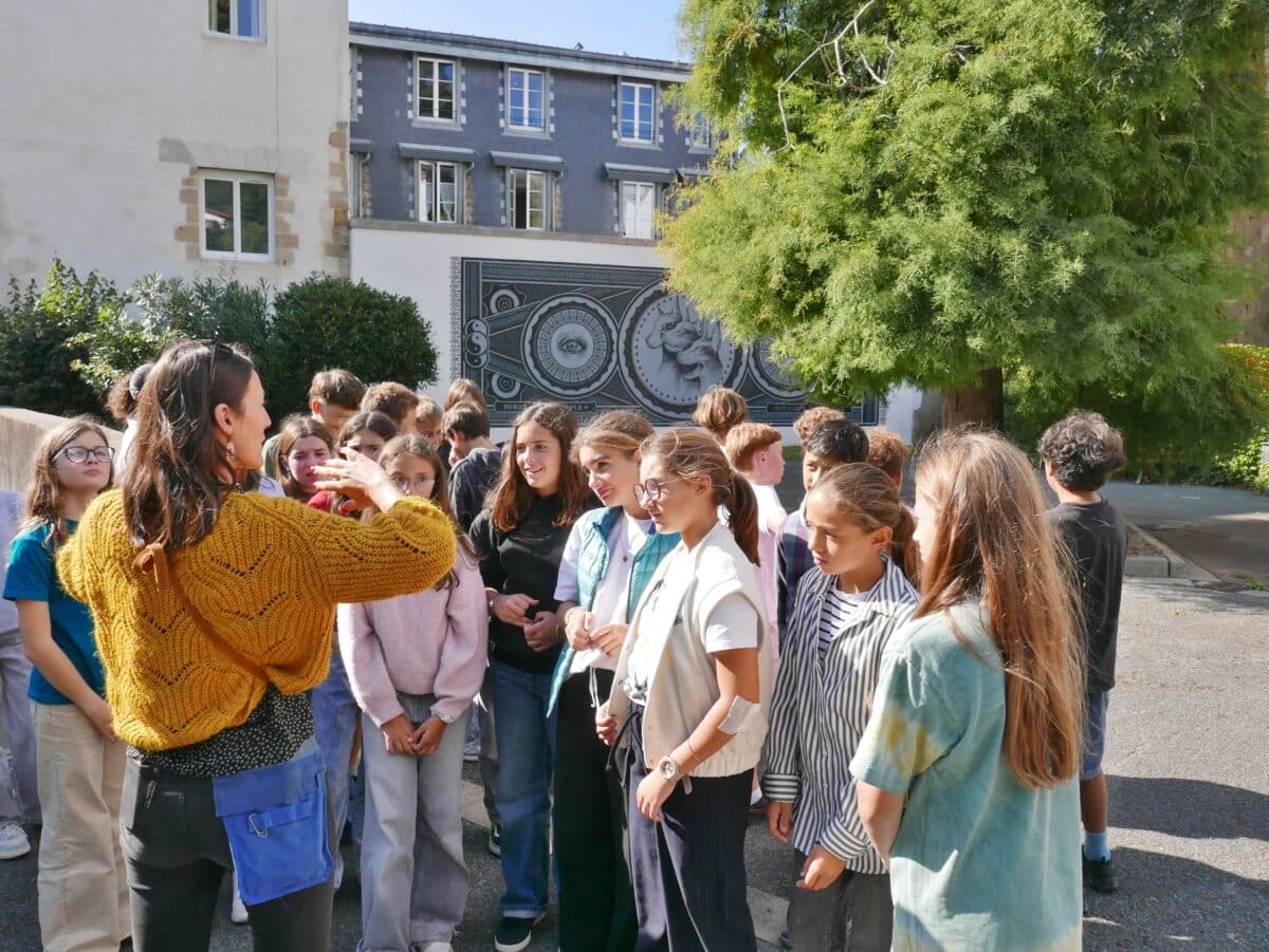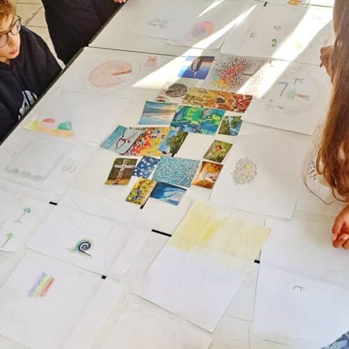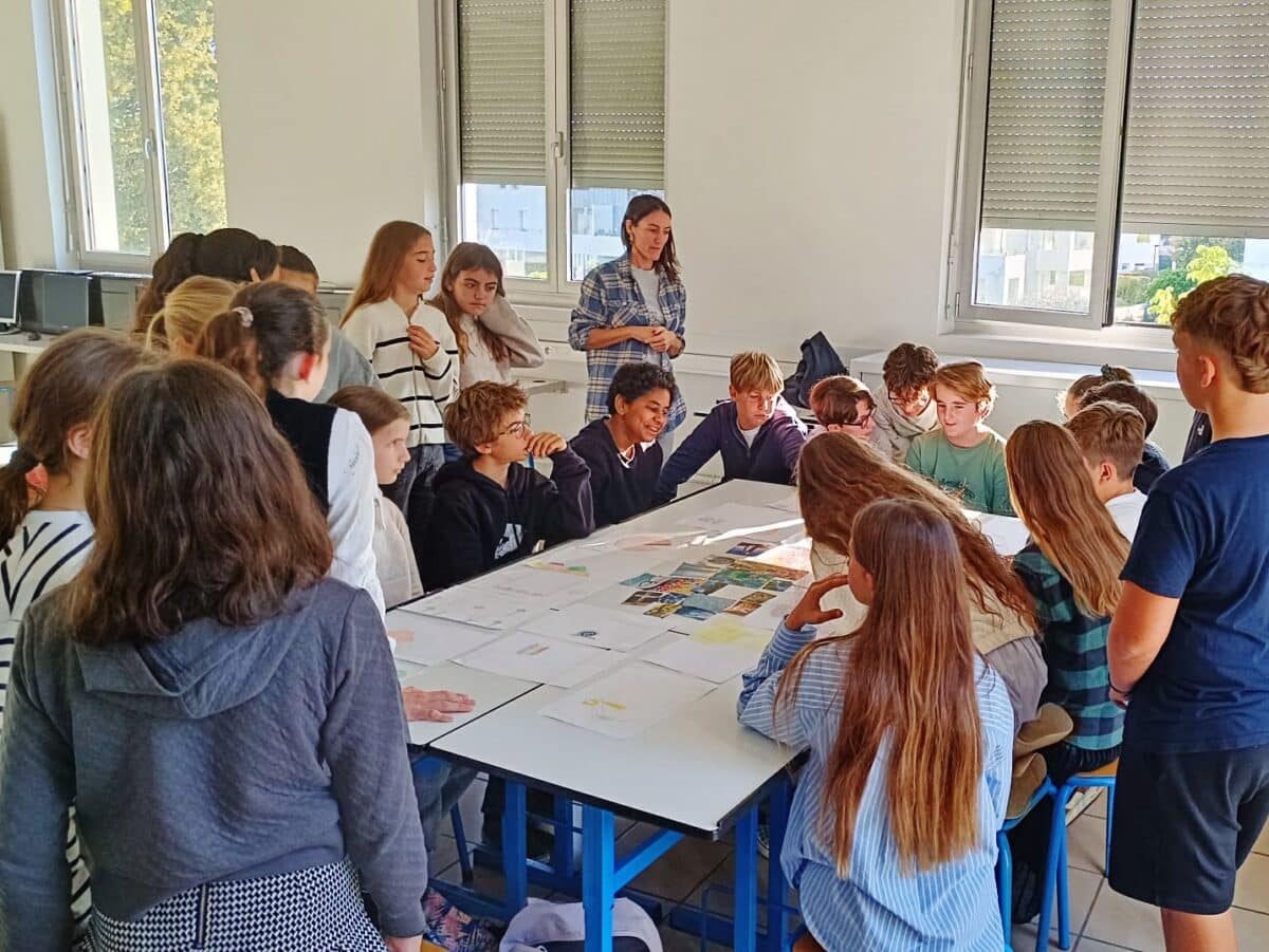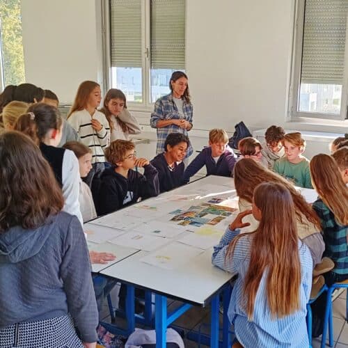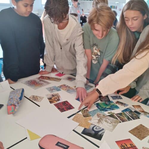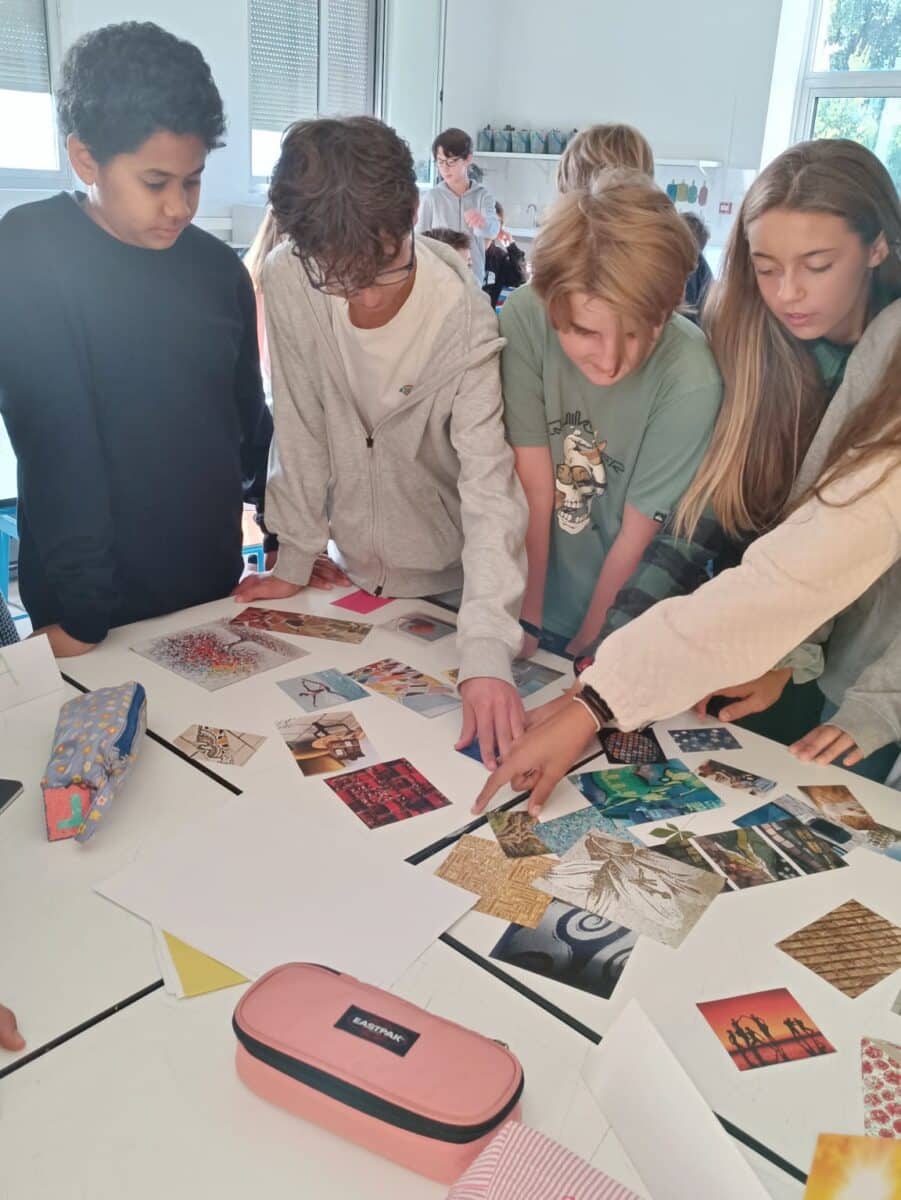 « Fragments » est un projet artistique dont la finalité sera la création d’une fresque en mosaïque qui prendra place au sol, entre les deux serres au jardin pédagogique du collège. Ce projet amènera les élèves de 5B et 5D à collaborer avec l’artiste Elsa Langlais et Alice, de l’association La Source Garouste-Iturria. Une première rencontre a eu lieu le vendredi 10 octobre 2025, à l’occasion d’une sortie dans Bayonne : guidés par Elsa, les élèves ont notamment découvert Le voyage intérieur, escalier en mosaïque situé rue de la Cabotte. Puis l’artiste est venue au collège pour une séance de conception. Chaque classe a alors mené une réflexion et réalisé des dessins autour de la question « Qu’est-ce qui nous nourrit ? ». Les éléments produits lors de ces premiers ateliers serviront pour créer la fresque collective.