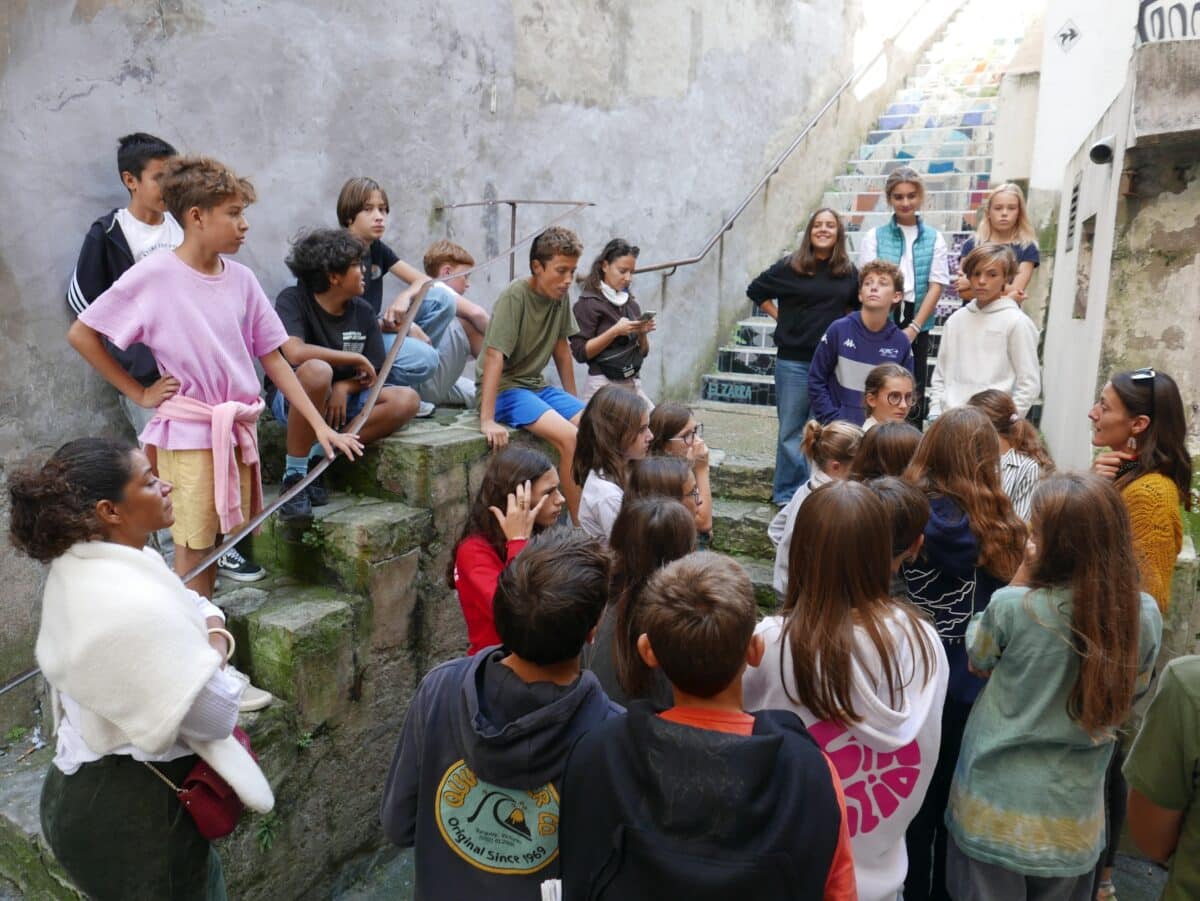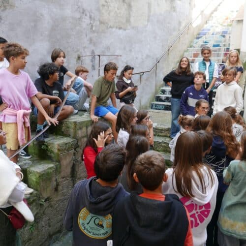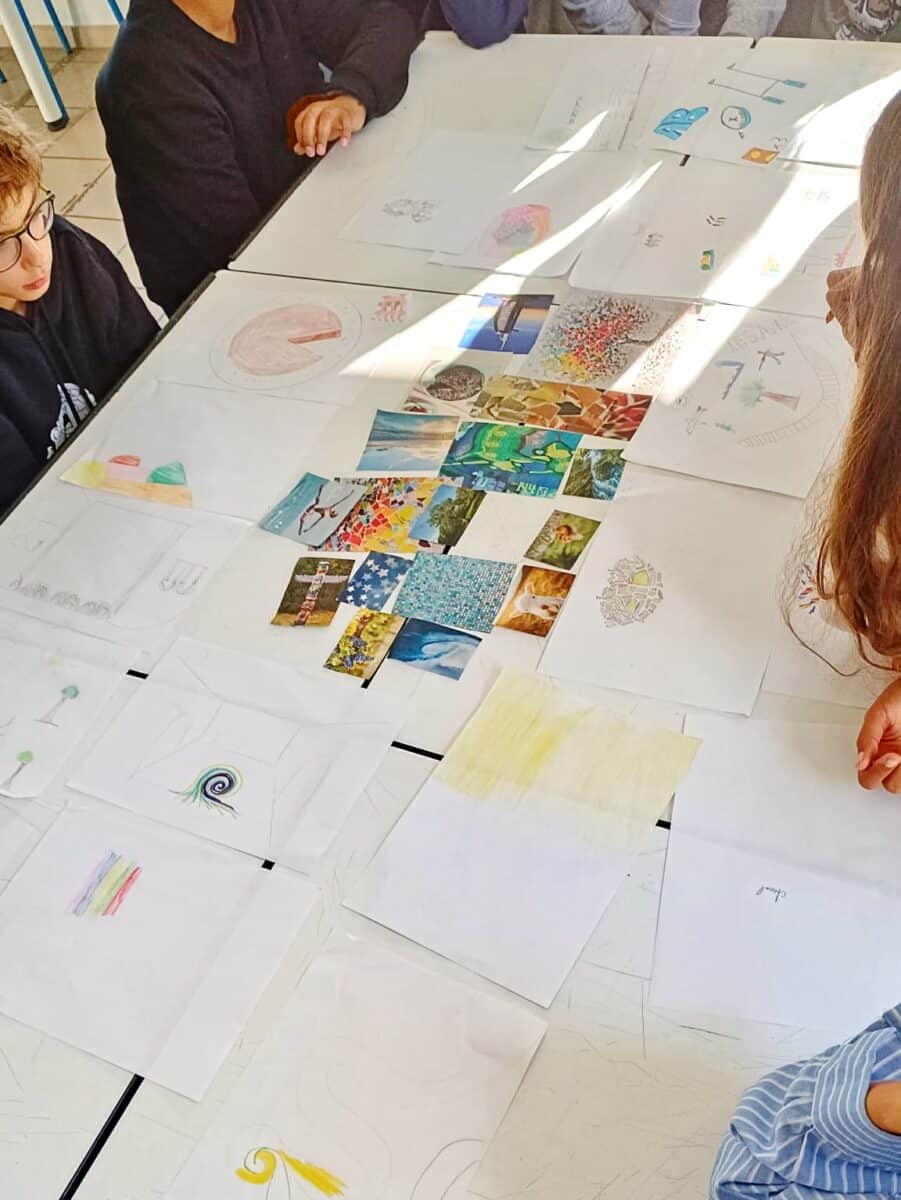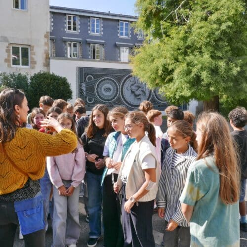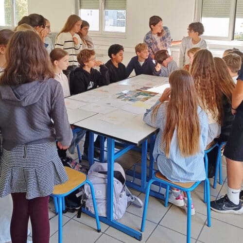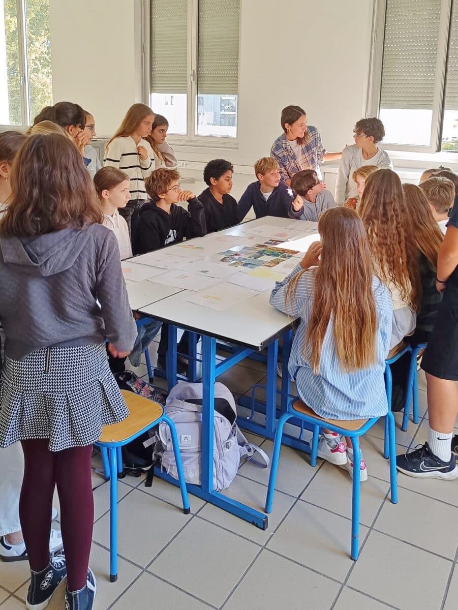 « Fragments » est un projet artistique dont la finalité sera la création d’une fresque en mosaïque qui prendra place au sol, entre les deux serres au jardin pédagogique du collège. Ce projet amènera les élèves de 5B et 5D à collaborer avec l’artiste Elsa Langlais et Alice, de l’association La Source Garouste-Iturria. Une première rencontre a eu lieu le vendredi 10 octobre 2025, à l’occasion d’une sortie dans Bayonne : guidés par Elsa, les élèves ont notamment découvert Le voyage intérieur, escalier en mosaïque situé rue de la Cabotte. Puis l’artiste est venue au collège pour une séance de conception. Chaque classe a alors mené une réflexion et réalisé des dessins autour de la question « Qu’est-ce qui nous nourrit ? ». Les éléments produits lors de ces premiers ateliers serviront pour créer la fresque collective.