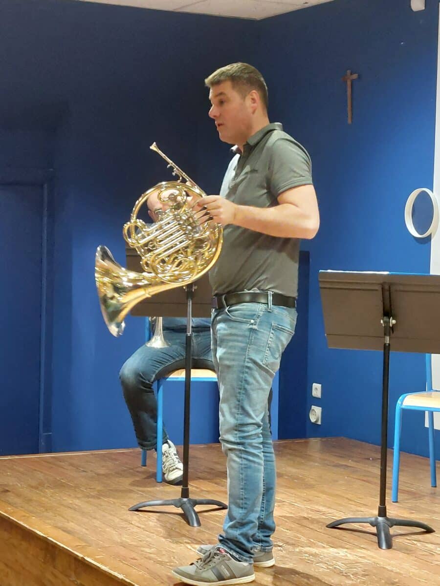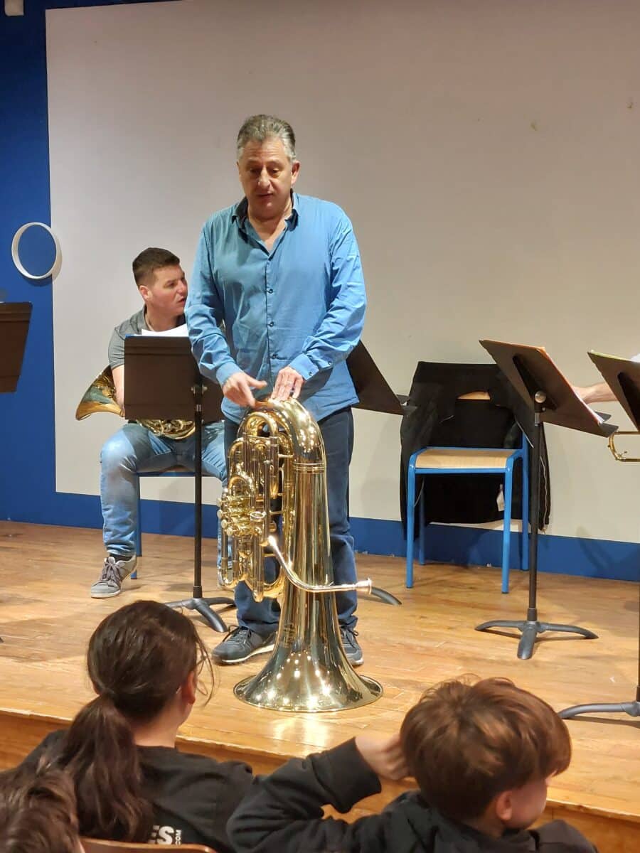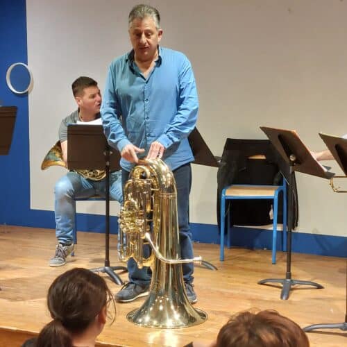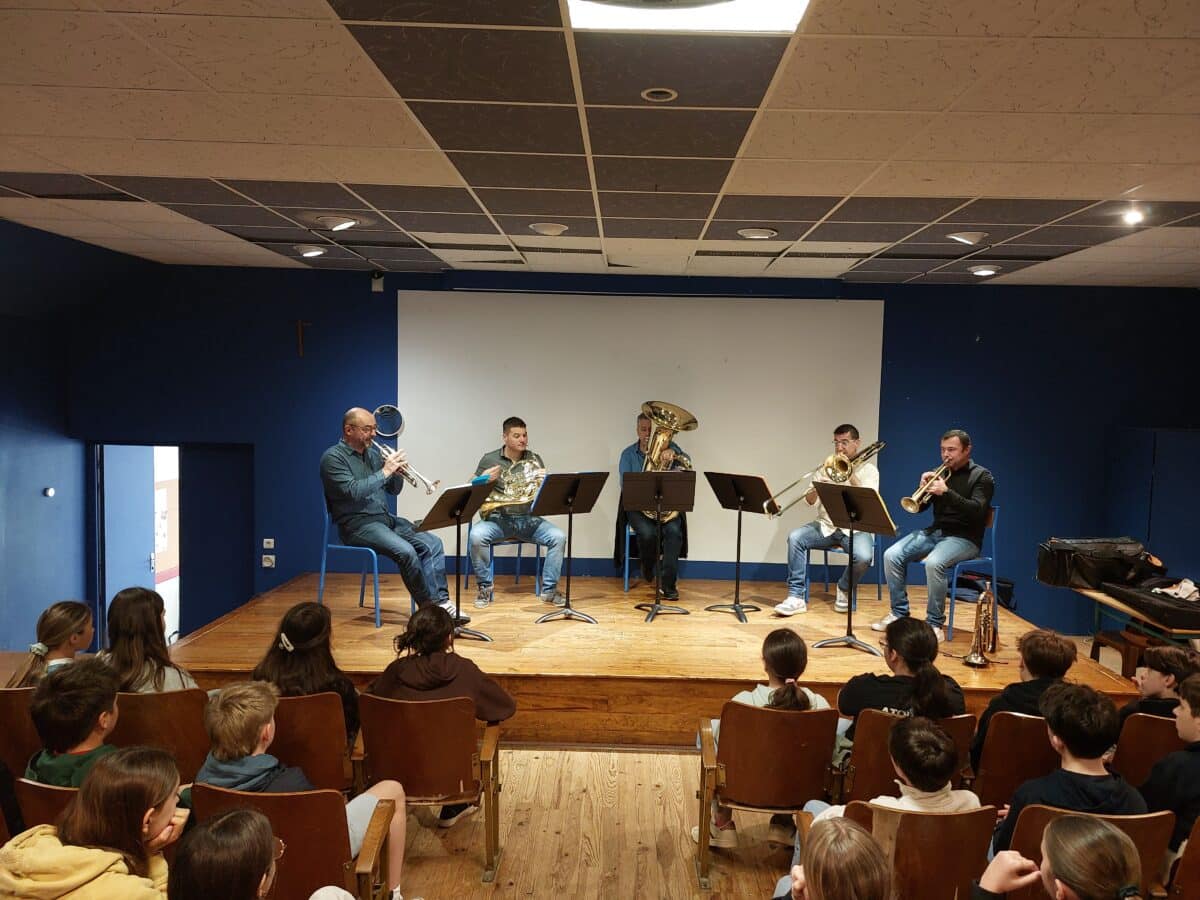Les musiciens ont présenté leurs instruments en expliquant leurs particularités sonores, les différentes techniques de jeu et le répertoire d’un quintette de cuivres, de l’époque baroque à nos jours. Les élèves ont particulièrement apprécié le medley West Side Story.