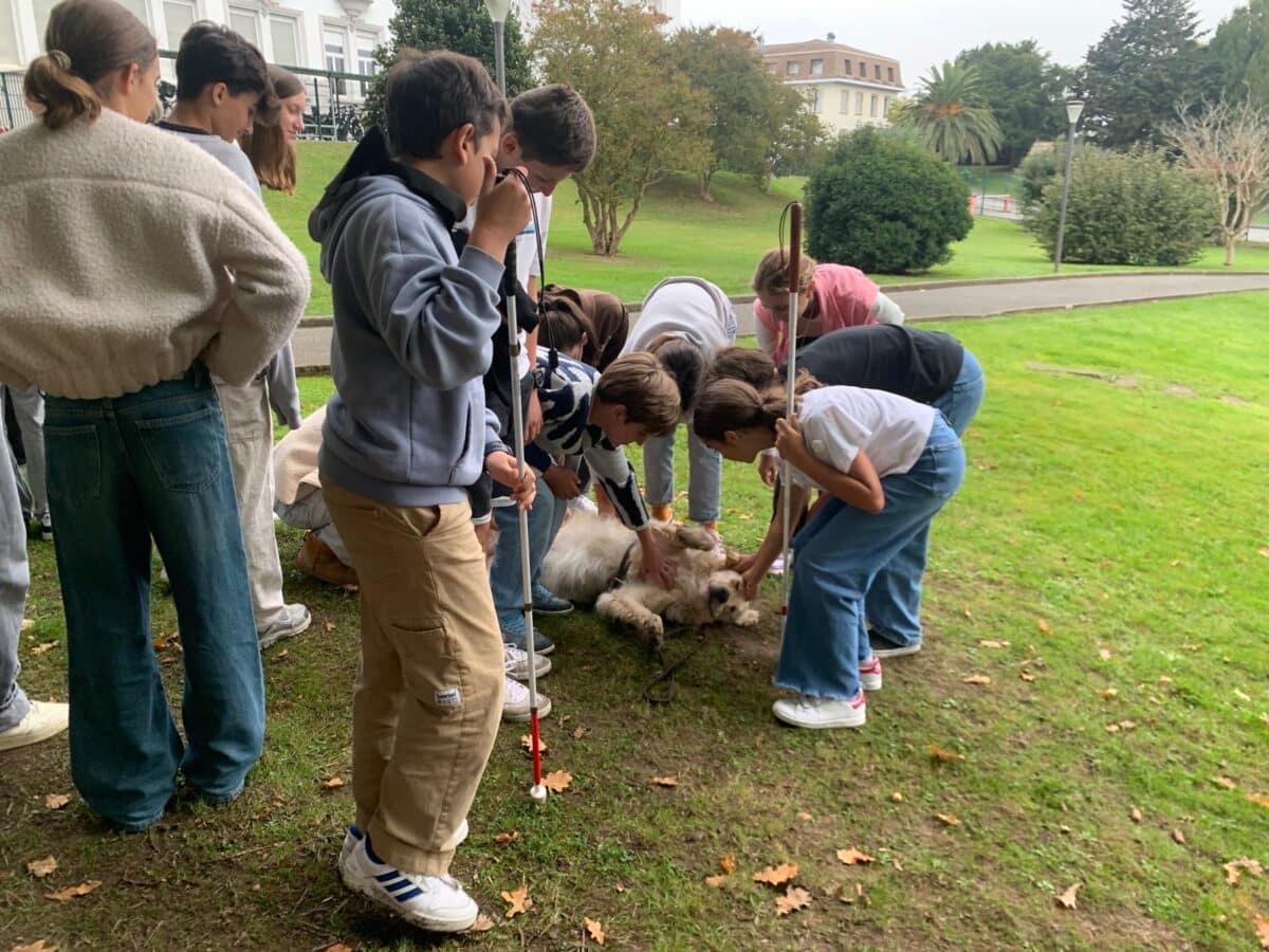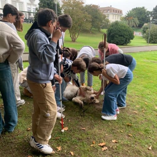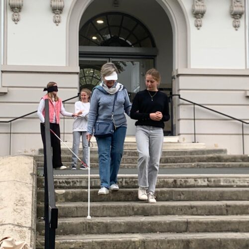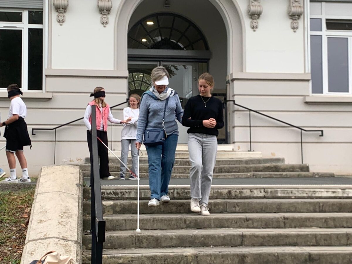 Dans un second temps, les élèves ont eu l’occasion de s’initier au maniement de la canne blanche et d’apprendre les techniques de guidage des personnes déficientes visuelles.