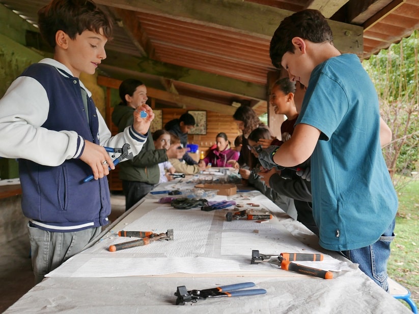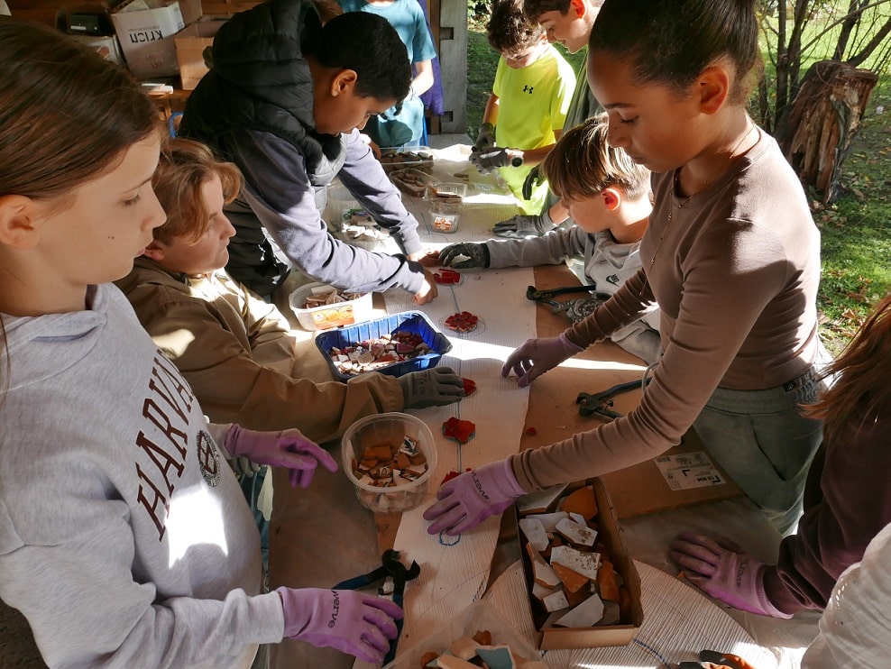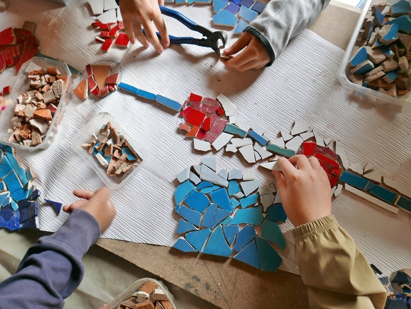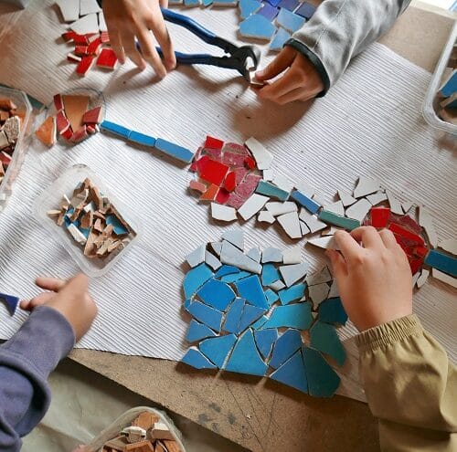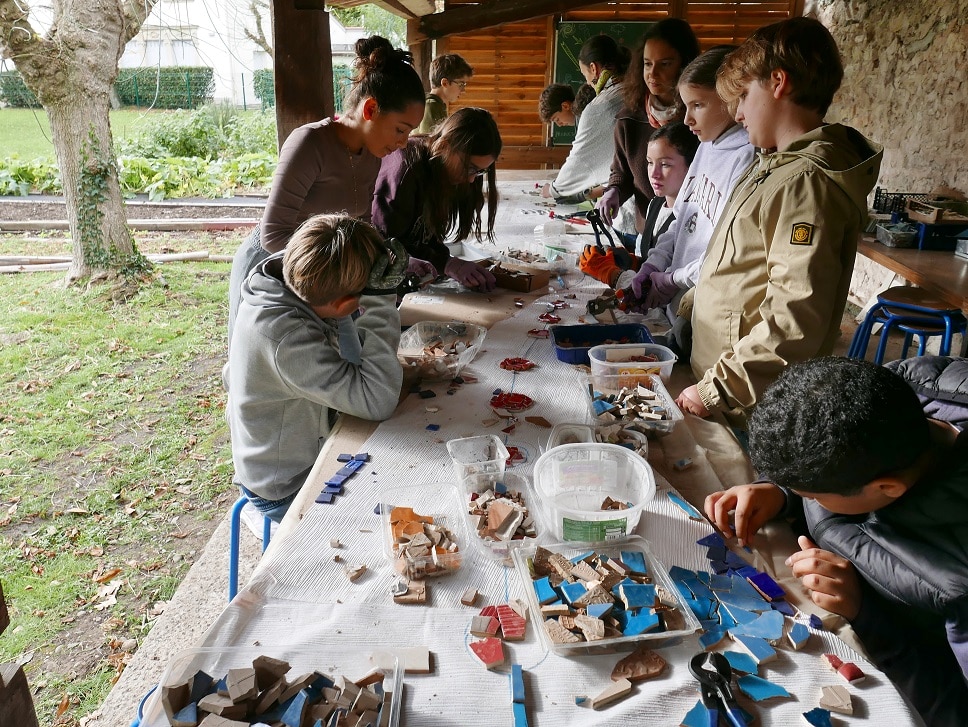 Après avoir rencontré l’artiste Elsa Langlais et découvert son travail, puis réfléchi à la question « qu’est-ce qui nous nourrit ? » (qui sert de fil conducteur à la création de la mosaïque), le temps est enfin venu de passer à l’action ! Pendant deux semaines, les élèves de 5B et 5D participent à tour de rôle à des ateliers de préparation de la mosaïque. Au programme, il s’agit de travailler avec du carrelage récupéré pour casser, couper, trier, assembler, ajuster… Peu à peu, la mosaïque prend forme dans la classe du jardin. Dernière étape du projet au mois de janvier : la mosaïque sera posée au sol, entre les deux serres du jardin pédagogique.