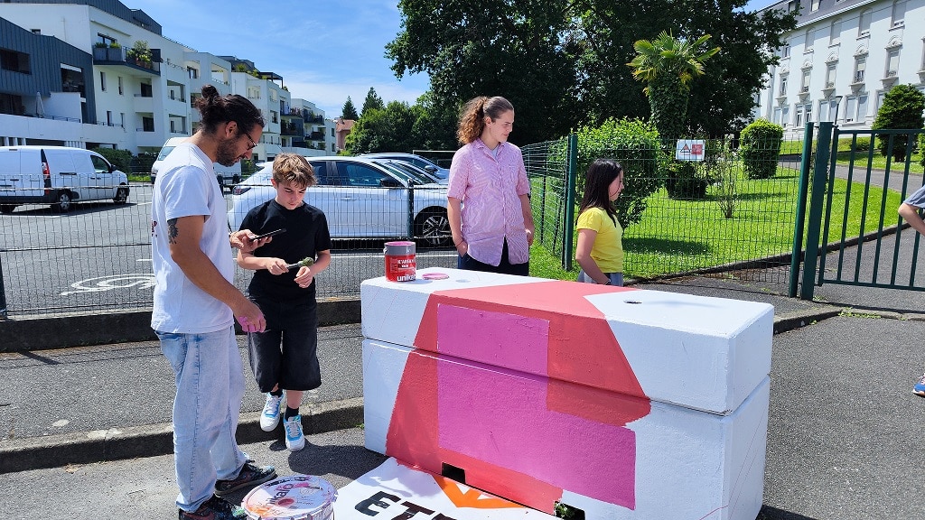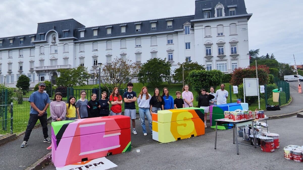 Dans le cadre du conseil de vie collégienne, un groupe composé d’élèves de la 6ᵉ à la 3ᵉ a réalisé une fresque afin de colorer les trois blocs en béton situés à l’entrée du collège. Pour cette réalisation, ils ont été accompagnés par l’association biarrote Updaters.