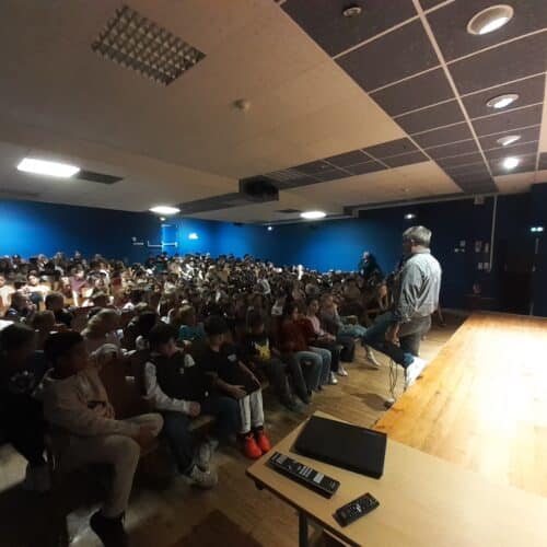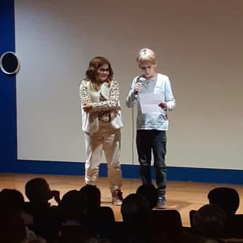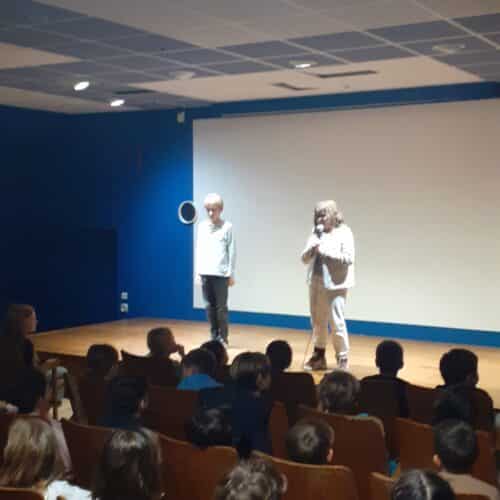 Vendredi 7 novembre, les 6 classes de CM ont pris place en salle de cinéma pour la présentation du concours national des Petits Champions de la lecture. Les candidats volontaires liront pendant 3 minutes l’extrait d’un livre de leur choix. Pour cette première étape, chaque classe devra désigner la meilleure lectrice et le meilleur lecteur avant le 19 décembre. Nous avons visionné la prestation du vainqueur de la finale nationale 2025 et nous avons écouté le témoignage de Jean, finaliste départemental et de Léonore, finaliste régionale, qui ont fait part d’une très belle aventure, un beau challenge qui aide à grandir. A vos marques, prêts, lisez !