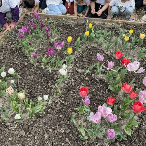 Dans le cadre du projet de liaison grande section CP , les 124 petits jardiniers des classes de GS , CP et CP/CE1 ont bravé le vent et la pluie le lundi 20 et mardi 21 novembre, pour planter environ 600 bulbes de narcisses, tulipes, muscaris et crocus offerts par Bulbs4Kids .